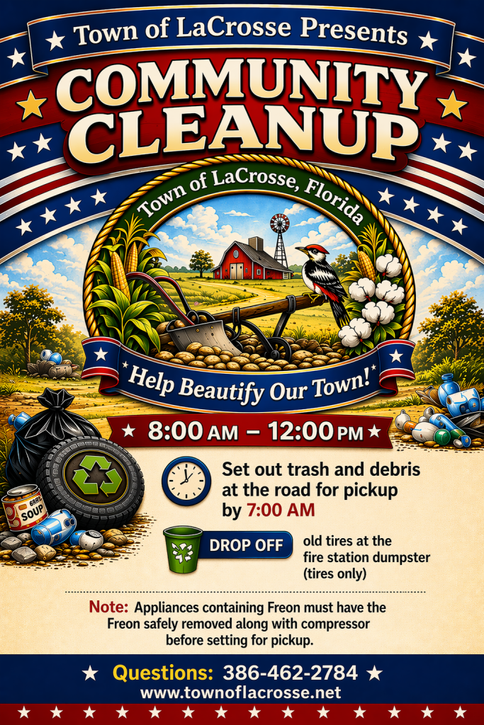 Welcome to the Town of LaCrosse, where tradition harmoniously blends with progress. Nestled in the heart of North Central Florida, our town is led by a dedicated council devoted to serving the community. We hold meetings every second Tuesday at Town Hall, fostering transparency and encouraging engagement from all residents.